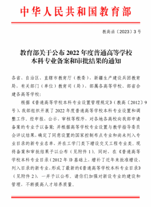 近日,教育部印发了《关于公布 2022 年度普通高等学校本科专业备案和审批结果的通知》(教高函〔2023〕3 号),福利姬 获批智能建造本科新专业。