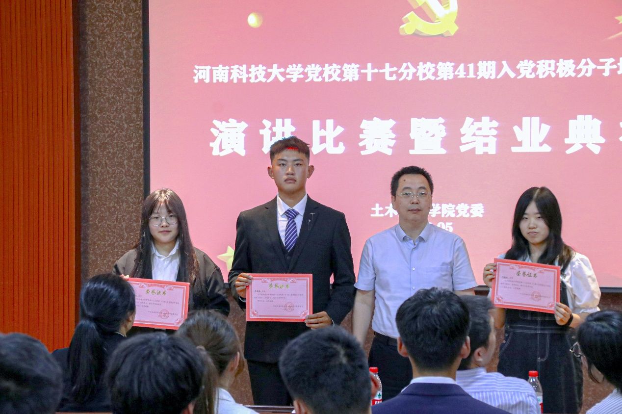 最终,覃星宇同学荣获一等奖,李帅帅同学获得二等奖,王嘉威同学、赵鑫岩同学获得三等奖。评委老师们为获奖选手和入党积极分子培训班优秀学员李帅帅同学、邱梦玲、毛敏如同学颁发了荣誉证书。