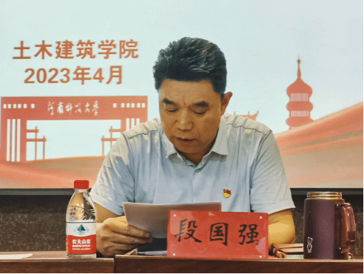 会上,段国强传达了学校学习贯彻习近平新时代中国特色社会主义思想主题教育工作部署会会议精神,介绍了学院已开展主题教育工作情况,并就学院主题教育工作进行了动员。学院于4月18日召开党委扩大会议,安排部署学院主题教育工作,决定成立学院主题教育领导小组,从博士点建设、人才引进、学生就业、新专业建设、专业认证(评估)五方面开展“推动学院发展、深入调查研究”活动。段国强要求,要提高政治站位,准确把握主题教育的总体要求、根本任务和具体目标;要强化组织领导,将理论学习、调查研究、问题整改、建立制度贯穿始终,推进主题教育落地见效;要结合各支部工作实际,扎实开展理论学习,做到学用结合、知行合一。