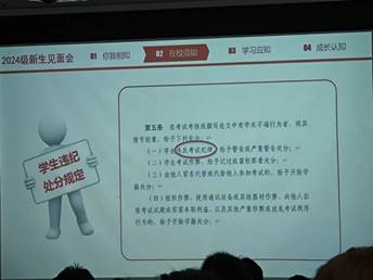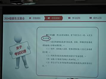 会议上,刘老师首先对全体新生的到来表示热烈欢迎,并强调了学校的各项规章制度对于维护校园秩序、促进学风建设、保障学生权益的重要性。随后,刘老师分别从“学生违纪处分规定”、“校纪校规”、“考试纪律”三个重点方面展开详细论述。他指出:“学校的各项规章制度不仅是学校的‘法’,更是每位学子成长路上的‘指南针’,希望大家能够自觉遵守,共同营造一个和谐、文明、向上的学习生活环境。”最后,刘老师号召全体新生严格遵守学校以及学院的各项规章制度,勤奋学习,积极进取,为成为一名优秀的大学生而不懈努力。