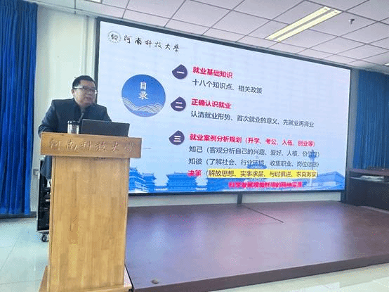 朱老师从正确理解就业的重要性、如何寻找适合自己的工作以及就业案例分析三个维度进行了深入的讲解。在讨论正确理解就业的重要性时,他首先引用了详尽的就业和考研数据,深入剖析了当前就业和考研的严峻形势,鼓励学生先就业再求发展;在如何寻找适合自己的工作方面,他从建立正确的就业观念、自我认知、简历撰写和面试技巧等多个角度为学生提供了具体的指导,鼓励学生培养适应力、创新意识、积极态度和坚强意志;在就业案例分析环节,他通过涵盖就业、升学、创业等多个领域的丰富案例,进行了多角度的分析,指导学生如何全面了解自身和外部环境,做出明智的职业选择。