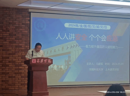 学院认真落实学校2024年防灾减灾日工作的要求,将防灾减灾教育纳入院党委理论学习中心组理论学习和教职工理论学习内容,围绕防灾减灾活动主题深入开展学习并组织研讨,研判化解风险隐患。利用教职工理论学习、学生主题班会,组织开展防灾减灾消防知识讲座,做到人人懂安全,事事保安全,推动防灾减灾宣传教育走深走实。 副院长马建军老师十分重视防灾减灾工作,于2024年5月9日下午4时,为学生开展相关讲座