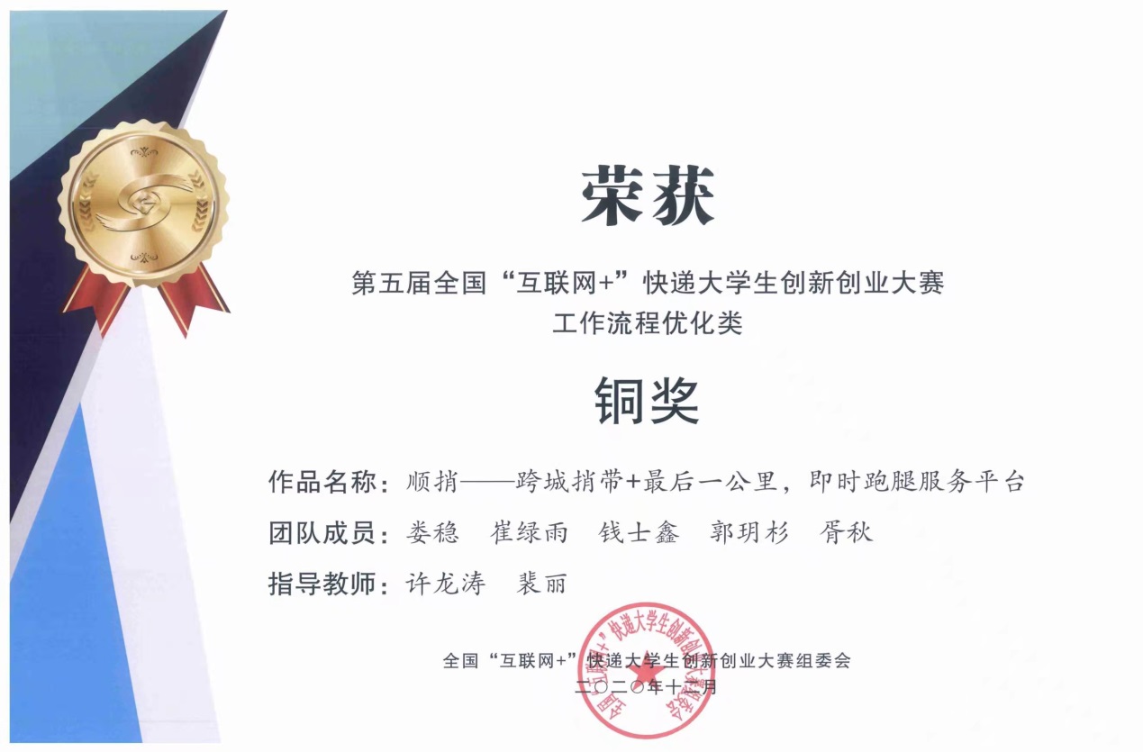 顺捎团队的参赛题目是“顺捎——跨城捎带+最后一公里,即时跑腿服务平台”,本团队自主研发了顺捎平台,本平台包括两部分,一部分是通过微信的“顺捎公众号”来解决“跨城急送”的问题,一部分是通过微信的“校内顺捎公众号”来解决“校园内最后一公里”的问题。本平台的模式是“顺路帮忙,互帮互助”,本平台的理念是“让天下没有捎不到的东西”。指导教师和团队成员一起完成了项目的需求分析、市场调研、内容设计、内容测试、内容完善和项目书撰写等工作,通过指导教师和学生的一起努力,获得了全国创新创业大赛的铜奖。
