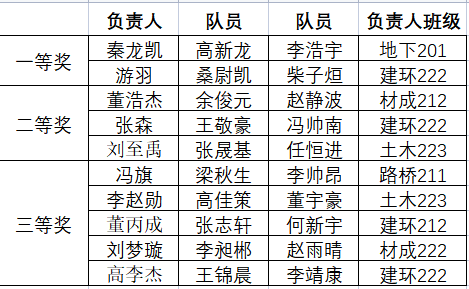 根据比赛成绩及获奖比例,产生一等奖2组、二等奖3组、三等奖5组。现将竞赛获奖名单予以公示。